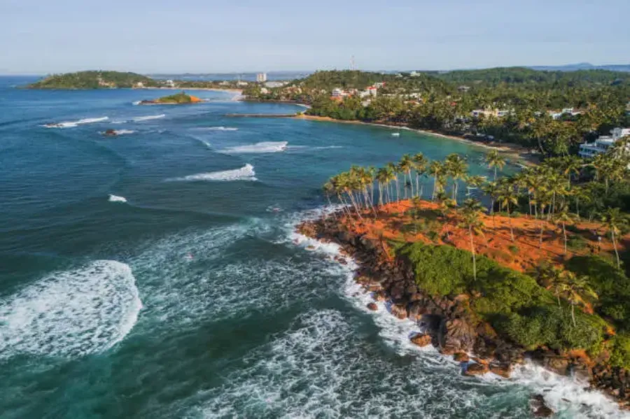Mirissa operates at a slightly slower pace than its neighbours on the south coast. The beach is a wide, gently curving bay with a small rocky island — Parrot Rock — at its eastern end, accessible via a sandbar at low tide, that provides an elevated vantage point above the beach for watching the sun go down. Locals and in-the-know travelers have been claiming their spot on Parrot Rock before sunset for years.