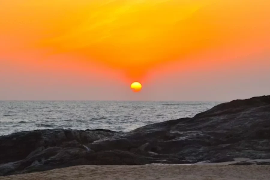 There are no beach bars here, no tourist infrastructure to speak of. A small temple sits nearby. Fishing boats move across the water. The wind off the open ocean is usually present and sometimes strong. As the sun descends toward the western horizon — with the ocean on three sides amplifying the light in every direction — the lighthouse above begins to catch the last gold in its white tower, and the surrounding headland goes from green to deep amber. This is a sunset point for those who want the experience stripped down to its essentials: just the edge of the land, the sea, and the changing sky.