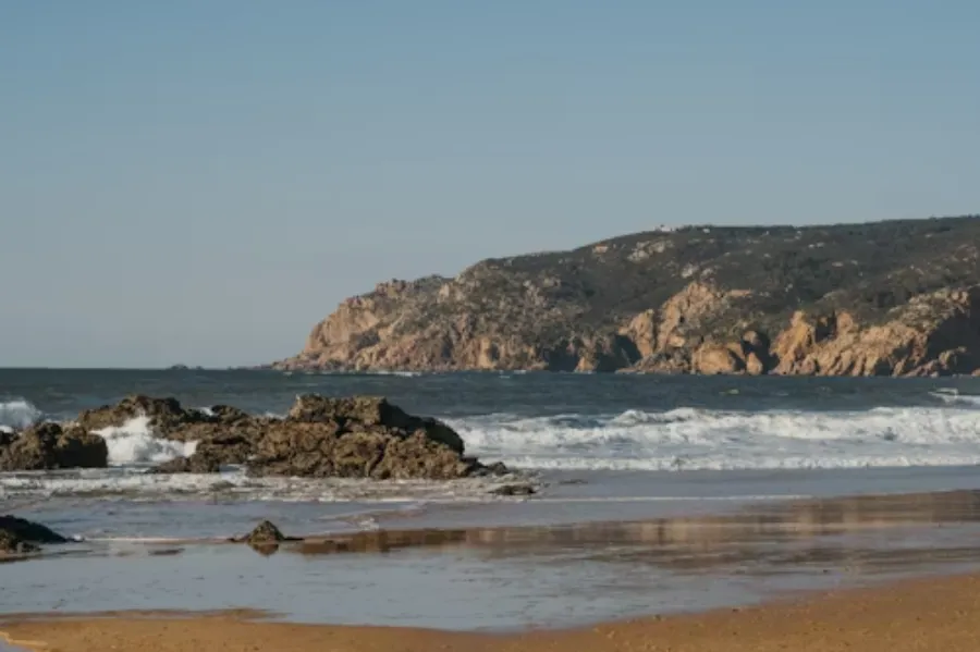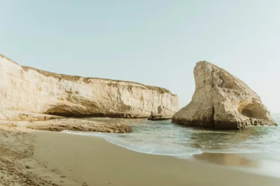 What draws photographers from around the world is Keyhole Arch — a gap in the offshore rock formations through which the setting sun aligns in winter months, sending a shaft of light directly through the stone and across the water. The effect, on a clear December or January evening, is extraordinary. The beach is also reliably windy and cold, and swimming is not recommended due to strong currents. This is a place to look at, not to swim in.