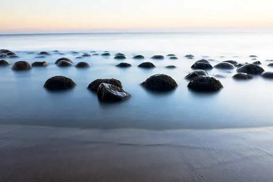 At low tide, something improbable happens along a short stretch of California's Mendocino Coast. Dozens of perfectly spherical boulders — some the size of basketballs, others as big as small cars — emerge from the sand in orderly rows, as if arranged by an obsessive sculptor. They're the result of a geological process called concretion, where minerals slowly accumulate around a central nucleus over millions of years, and the spheres you see today have been exposed by the steady erosion of the surrounding mudstone cliffs.