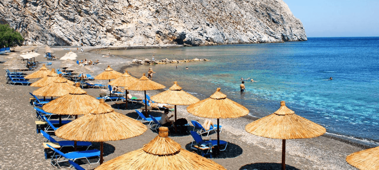 Perissa is well-equipped with sunbeds and umbrellas available for rent, and many beachfront cafés and bars offer free loungers with a purchase. The beach has received the “Blue Flag” award for cleanliness and water quality.