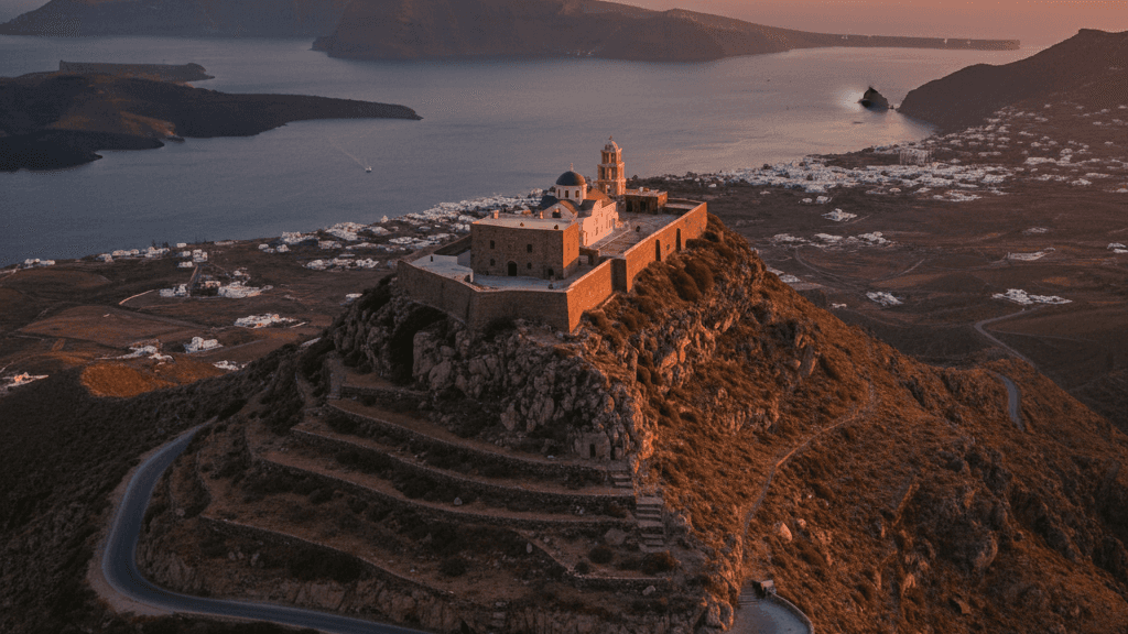 The mountain offers breathtaking panoramic views of the entire island and the Aegean Sea. Visitors can reach the monastery via a winding road or hiking trails from Pyrgos, Kamari, or Perissa.